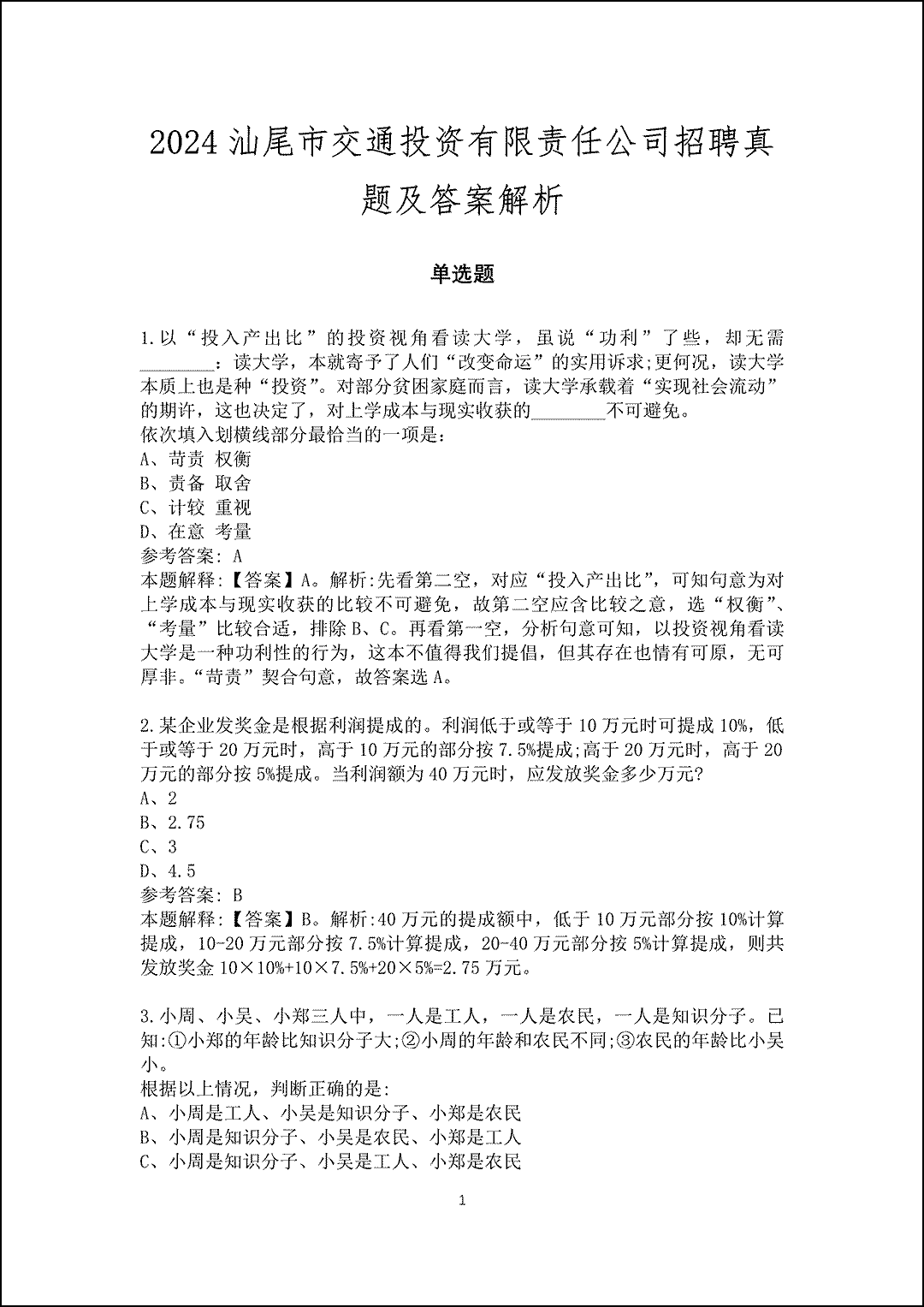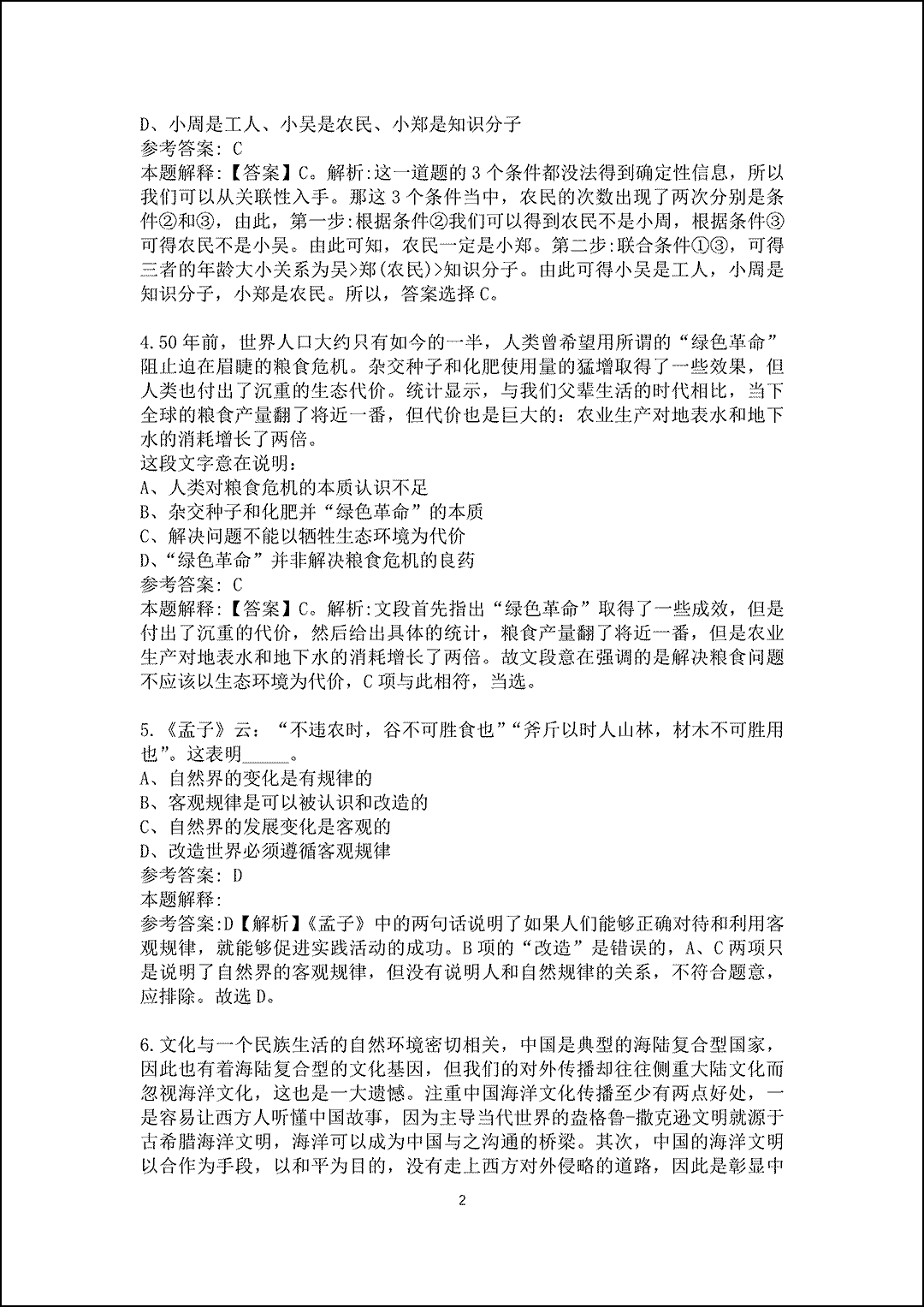 2021汕尾市交通投资有限责任公司招聘试题及答案解析1.政府在市场监管方面的主要职能不包括_____。 A、界定和保护各类产权B、创造良好的信用环境C、促进全国统一市场的形成D、对区域经济发展给予协调、指导和财政支持 参考答案: D 本题解释:【答案】D。解析:政府在市场监管方面的主要职能包括界定和保护各类产权,创造良好的信用环境,促进全国统一市场的形成,扩大市场对内对外开放,逐步消除行政性垄断,加强对自然垄断行业的规制,对产品定价和产品质量信息披露行为进行严格监管等。