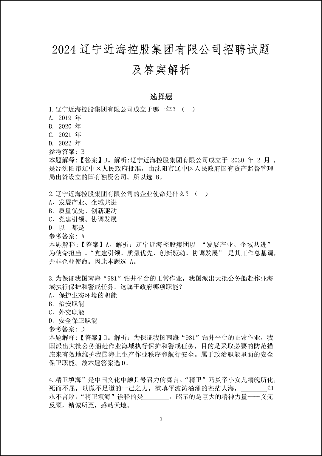 2022辽宁近海控股集团有限公司招聘试题及答案解析选择题1.职业道德规范的基础是_____。 A、爱岗敬业B、诚实守信C、服务群众D、奉献社会 参考答案: A 本题解释:【答案】A。解析:爱岗敬业是职业道德的基础,是社会主义职业道德所倡导的首要规范。爱岗就是热爱自己的本职工作,忠于职守,对本职工作尽心尽力;敬业是爱岗的升华,就是以恭敬严肃的态度对待自己的职业, 对本职工作一丝不苟。故本题答案选A。