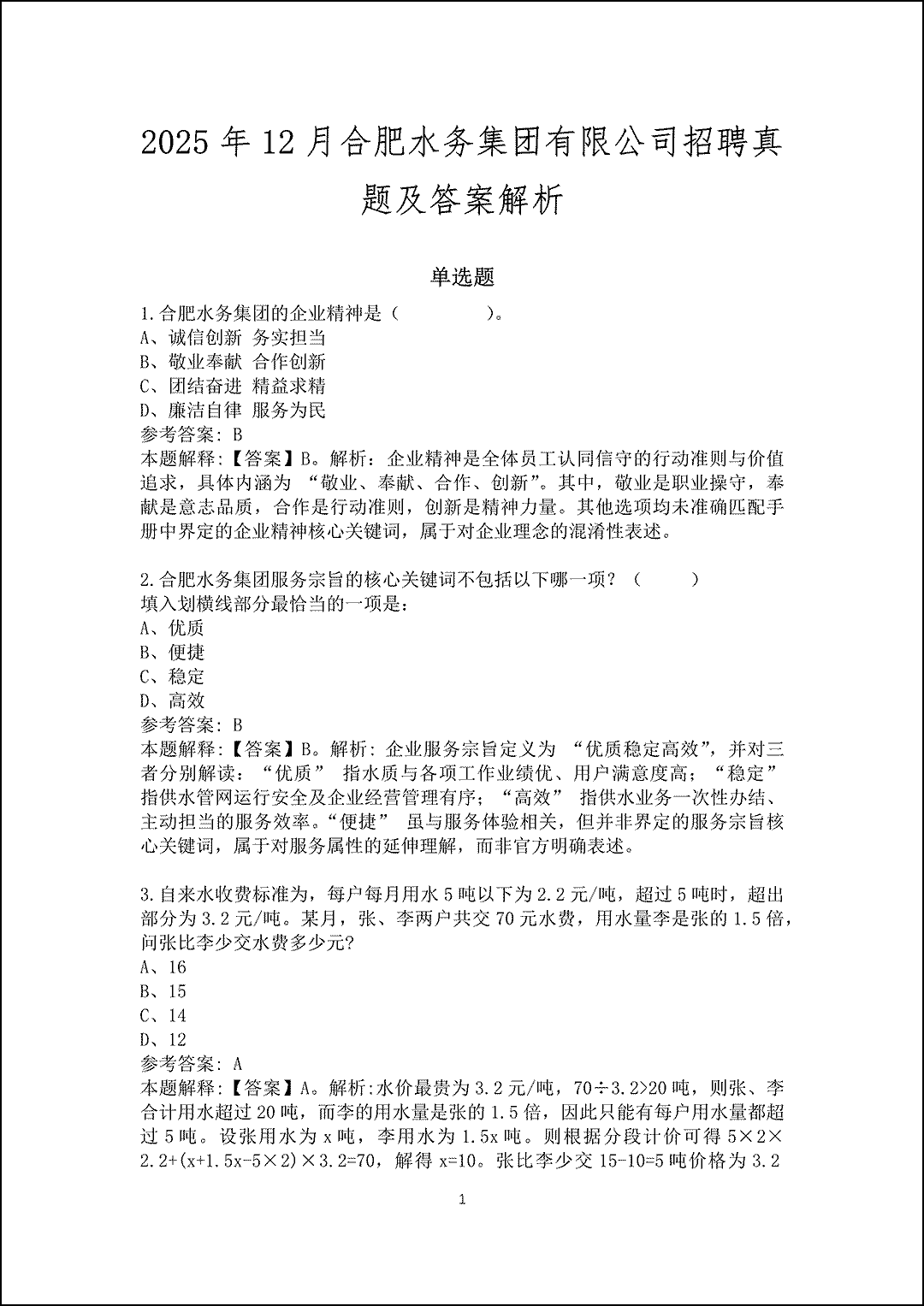 注意:此卷为合肥水务集团2025年12月真题卷,其他资料网站均为模拟卷