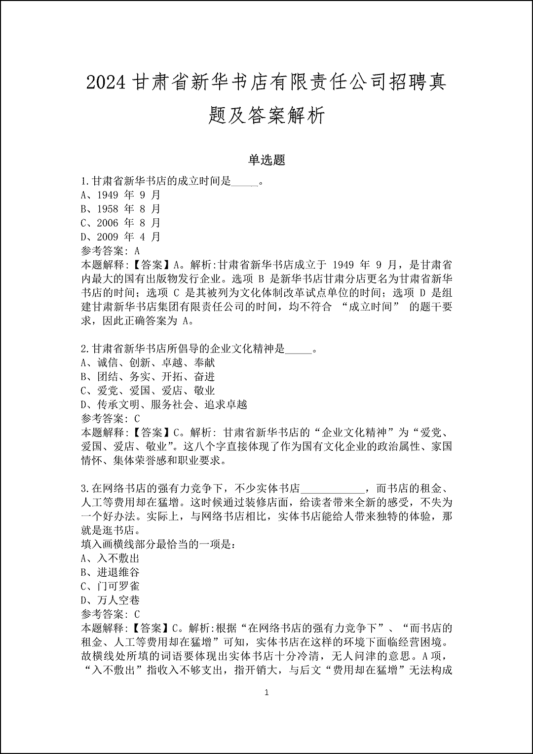 2023甘肃省新华书店有限责任公司招聘试题及答案解析(公共基础知识)单选题1. 2023年9月,以_____为主题的第十三届中国数字出版博览会将在敦煌举行。这是数博会首次在北京以外的省市举办。A、以数字出版为引领B、数智赋能 联结未来C、推动数字文化发展D、搭建数字经济新平台参考答案: B 本题解释:【答案】B。解析:2023年9月,以“数智赋能 联结未来”为主题的第十三届中国数字出版博览会在敦煌举行。这是数博会首次在北京以外的省市举办。故本题选B。