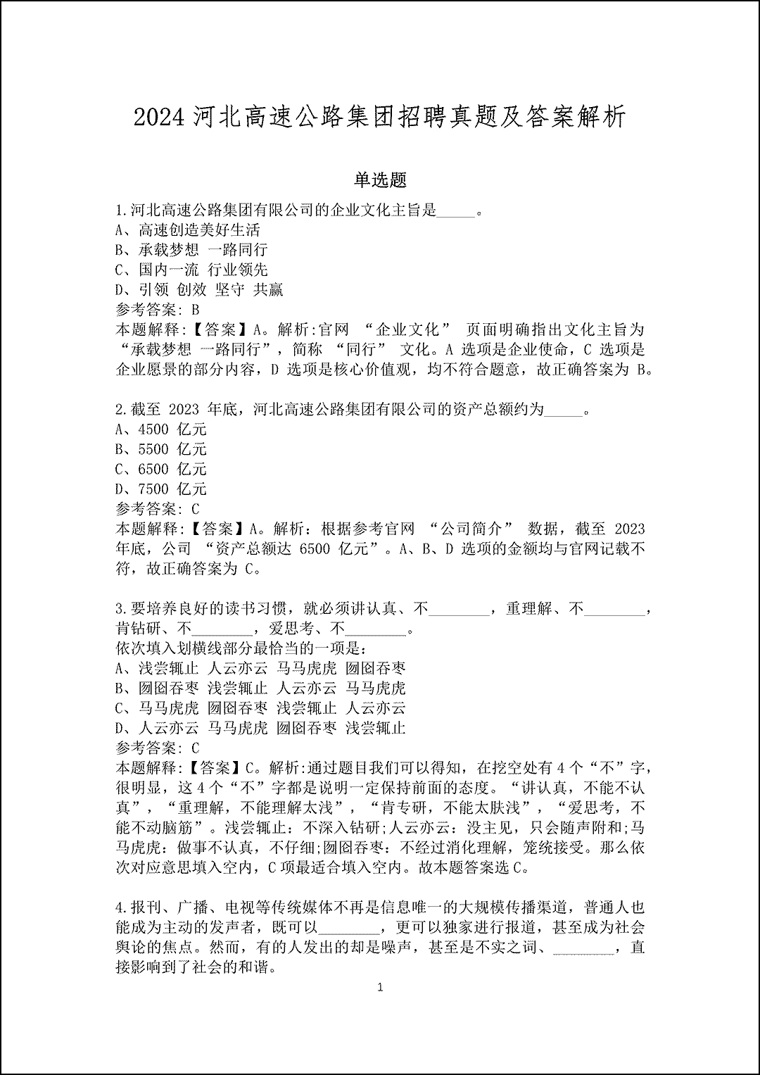 【独家更新】2024河北高速公路集团招聘真题及答案解析-国企真题-天天真题网